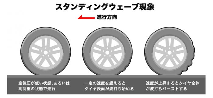 空気圧不足から起こる波打ち現象(スタンディングウェイブ)が起こるとタイヤ温度は一気に上昇し破裂する。